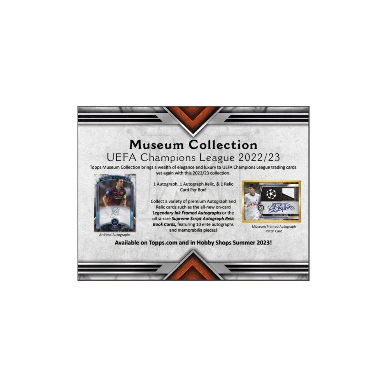 Each pack contains eight (8) 2022/23 Topps UEFA Champions League Museum Collection cards; includes four (4) Base Cards, one (1) autograph card, one (1) autograph relic card, one (1) relic card, and one (1) parallel card