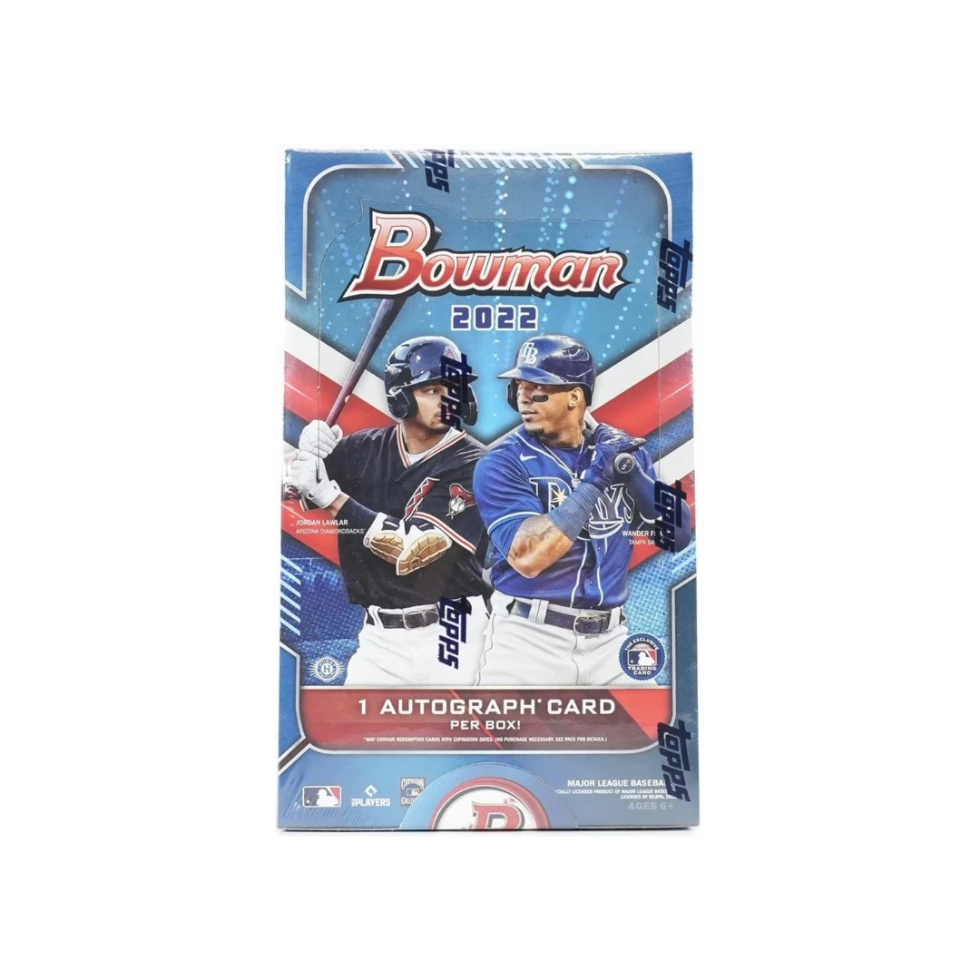 Each pack contains five (5) 2022 Bowman Baseball base cards, three (3) Paper Prospect cards, and two (2) Chrome Prospect cards. Includes one (1) autograph per box.