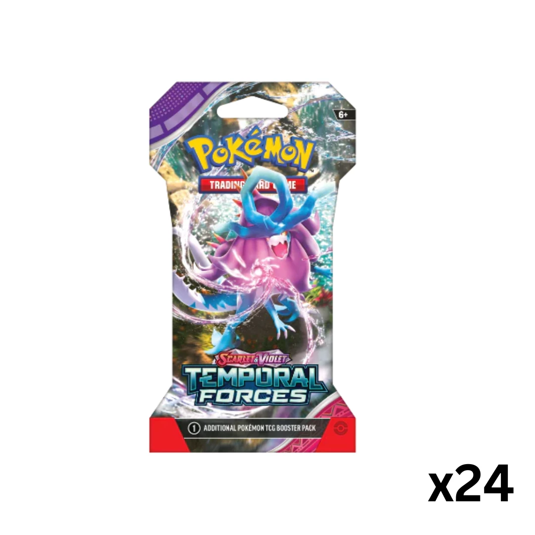 The ranks of Ancient and Future Pokémon continue to grow! Walking Wake ex breaks free of the past alongside Raging Bolt ex, while Iron Leaves ex delivers high-tech justice with Iron Crown ex. Outside Area Zero, Wugtrio and Farigiraf shift types as Tera Pokémon ex, and Pokémon Trainers everywhere prepare for the return of ACE SPEC cards with uniquely powerful effects. A rupture in time brings wild beasts and cyber visions to battle in the Scarlet & Violet—Temporal Forces expansion!