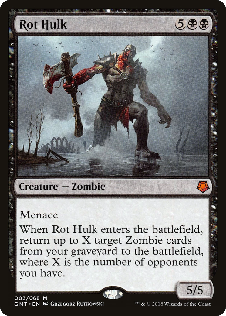 When Rot Hulk enters the battlefield, return up to X target Zombie cards from your graveyard to the battlefield, where X is the number of opponents you have.